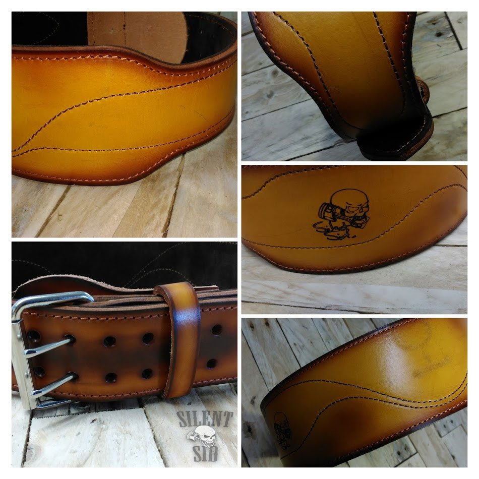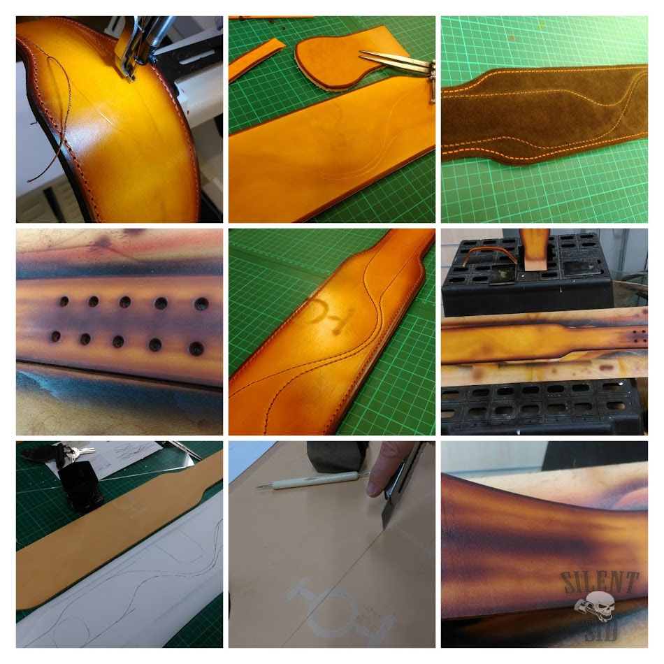 When I first saw the Leather Hide I knew I had to do something special with it. It had this fantasic original Branding mark from when the beast was roaming the countryside and it just felt right to show the Brand off in the belt design. From cutting the leather right through to dying and chosing the stitch pattern - the cattle brand marking was at the heart of it. I chose a classic rugged western style colour scheme with airbrushed accents - then came the twin colour stitch pattern in Brown and 'Rust' colours. Of course, it was only right to 'Brand' the finished belt with our 'Silent Sid' logo. We've had this belt on display in the shop and it's brought universal approval - everyone has given positive comments on it's design.